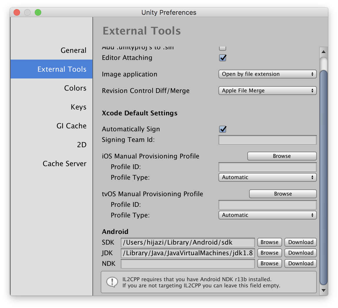 After installed JDK and SDK, you need to specify the path in the Unity. While Unity app is running, open Unity Preferences, choose ‘External Tools’, scroll down until you find Android section as figure below.